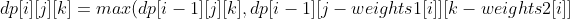 由于费用增加一维,则此时状态转移公式也需要增加一维,变为 dp[i][j][k],用来表示前 i 件物品付出两种费用为 j 和 k 时可以获得的最大价值。此时的状态转移公式为: